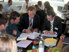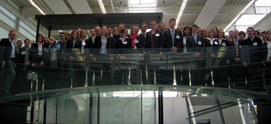 Am 9. November machte sich daher einmal mehr um 7.00 Uhr morgens eine bunt gemischte Gruppe aus Bachelor- und Masterstudenten sowie Lehrkräften per Bus auf den Weg ins Schwäbische. Die erste Station des Tages war das Unternehmen seele in Gersthofen bei Augsburg. Die wenigsten von uns hatten wohl schon einmal von dieser Unternehmensgruppe gehört, doch nahezu jeder weiß wie die Apple Shops rund um den Globus aussehen – in der Regel sehr gläsern. Nun waren wir in dem mittelständischen Unternehmen zu Gast, das diese Shops baut. Die seele Unternehmensgruppe entwirft und baut gigantische Gebäudehüllen, vorzugsweise aus Glas. Zu den größten Projekten zählen wohl der Apple Cube in New York, der Bahnhof Straßburg und das Nationalstadion in Peking. Derzeit baut das Unternehmen einen der wichtigsten Bahnhöfe Londons, Kings Cross, um und ab 2011 wird der Flughafen Berlin Schönefeld komplett neu gestaltet. Das bevorzugte Auftragsvolumen dieses mittelständischen Unternehmens liegt bei ca. 5 – 10 Mio. Euro, bei prestigeträchtigen Aufträgen, wie im Fall Apple, wird aber auch ein Auftrag von nur ca. 2 Mio. Euro gefertigt. Wir waren eingeladen zwei Unternehmen der seele Gruppe näher kennen zu lernen. Nach einer Begrüßung durch Herrn Kaiser, den kaufmännischen Leiter der seele GmbH, nahmen wir an zwei verschiedenen Führungen durch das Unternehmen teil. Herr Kacan führte uns durch die Produktionshallen der seele GmbH und erläuterte uns die verschiedenen Produktionsbereiche. Hier werden vor allem Stahl- und Aluminiumkonstruktionen gefertigt, die zum Großteil als Unterkonstruktionen für spektakuläre Gebäudehüllen aus Glas dienen. Herr Hirschberger stellte uns später das Unternehmen Sedak vor, das spezielle Glaskonstruktionen fertigt. So wurde hier die wohl weltweit größte Glasscheibe von ca. 12 Metern Länge und knapp 4 Meter Breite für den Apple Store in Sydney gefertigt. Er erläuterte uns die verschiedenen Glaskonstruktionen und speziellen Fertigungstechniken, mit Hilfe derer solch riesige Scheiben gefertigt werden können. Auf Kundenwunsch werden die verschiedensten Dinge aus Glas gefertigt. Eine dieser besonderen Werke – eine Glasbrücke – konnten wir sogar vor Ort bewundern und begehen. Der überaus unterhaltsame Vormittag wurde mit einem Weißwurstfrühstück mit Brezeln und Weizen abgerundet, wobei die Mitarbeiter von seele uns für alles Fragen offen zur Verfügung standen.